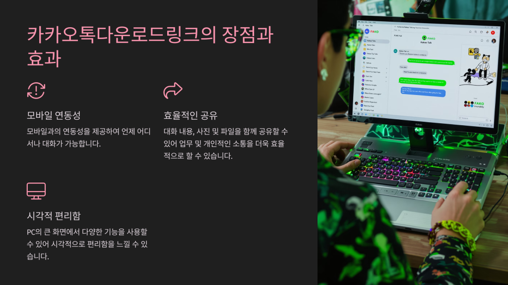 첫째, 모바일과의 연동성을 제공하여 언제 어디서나 대화가 가능합니다. 둘째, 대화 내용, 사진 및 파일을 함께 공유할 수 있어 업무 및 개인적인 소통을 더욱 효율적으로 할 수 있습니다.